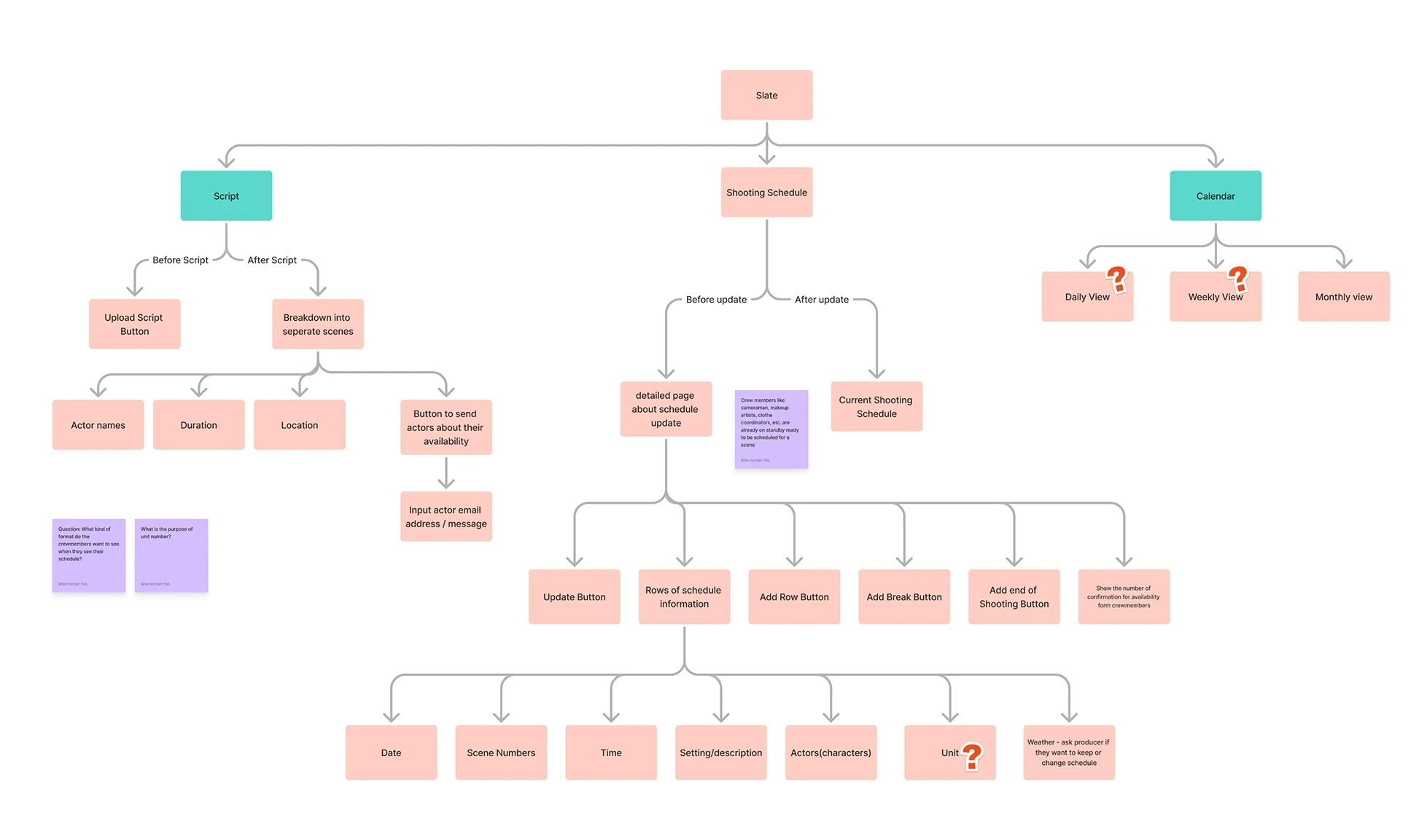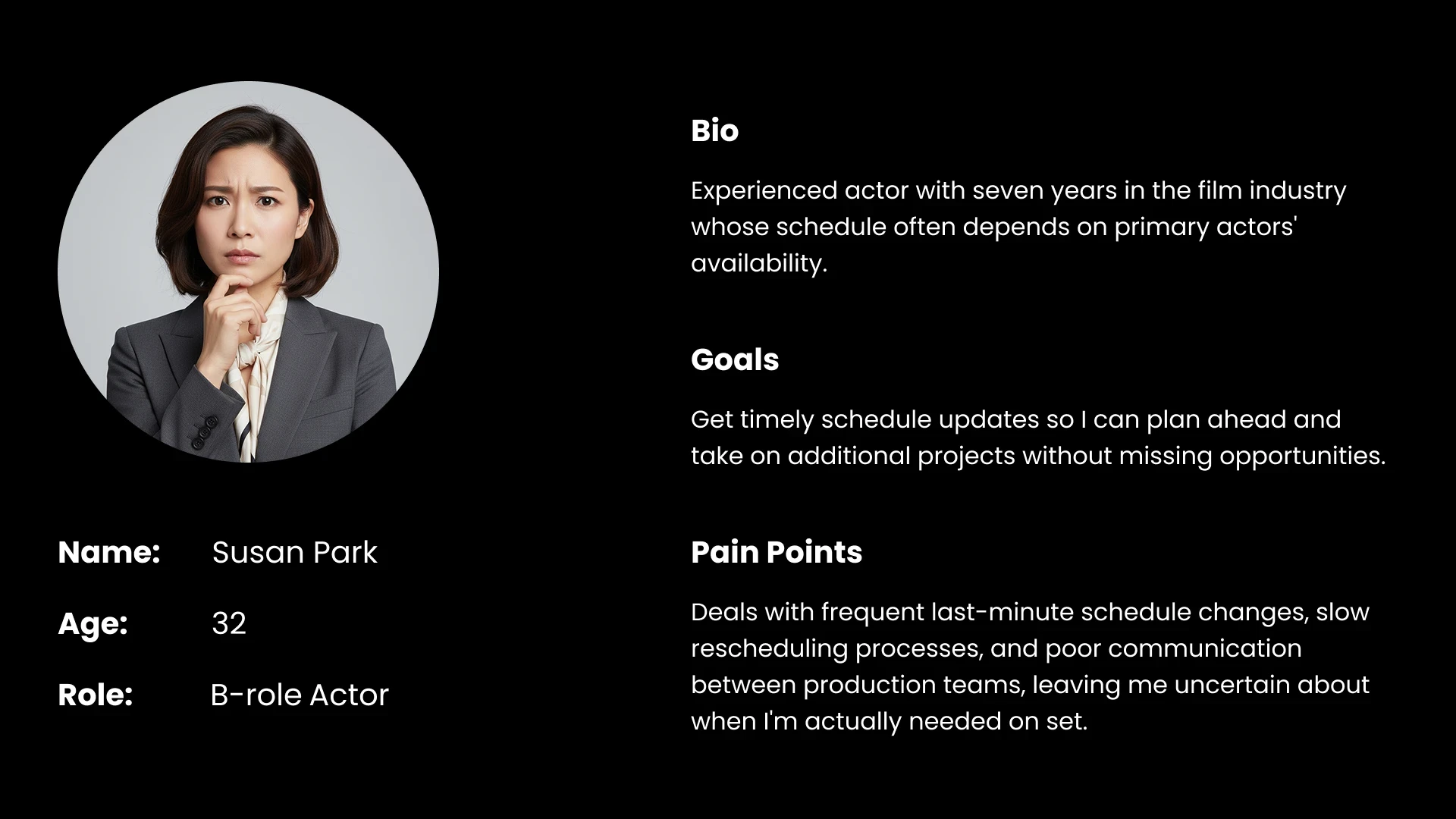 By conducting interviews, surveys, and competitive analysis with film producers and crew members, we gained insights into their scheduling workflows and pain points. We also spoke with actors as a secondary audience to understand their availability challenges. These interviews informed us about users' production experience, coordination habits, current scheduling methods, and communication preferences.