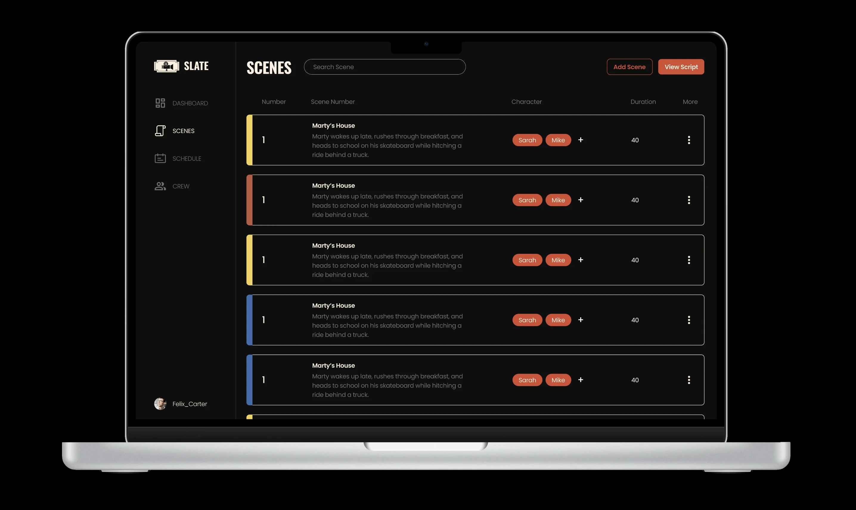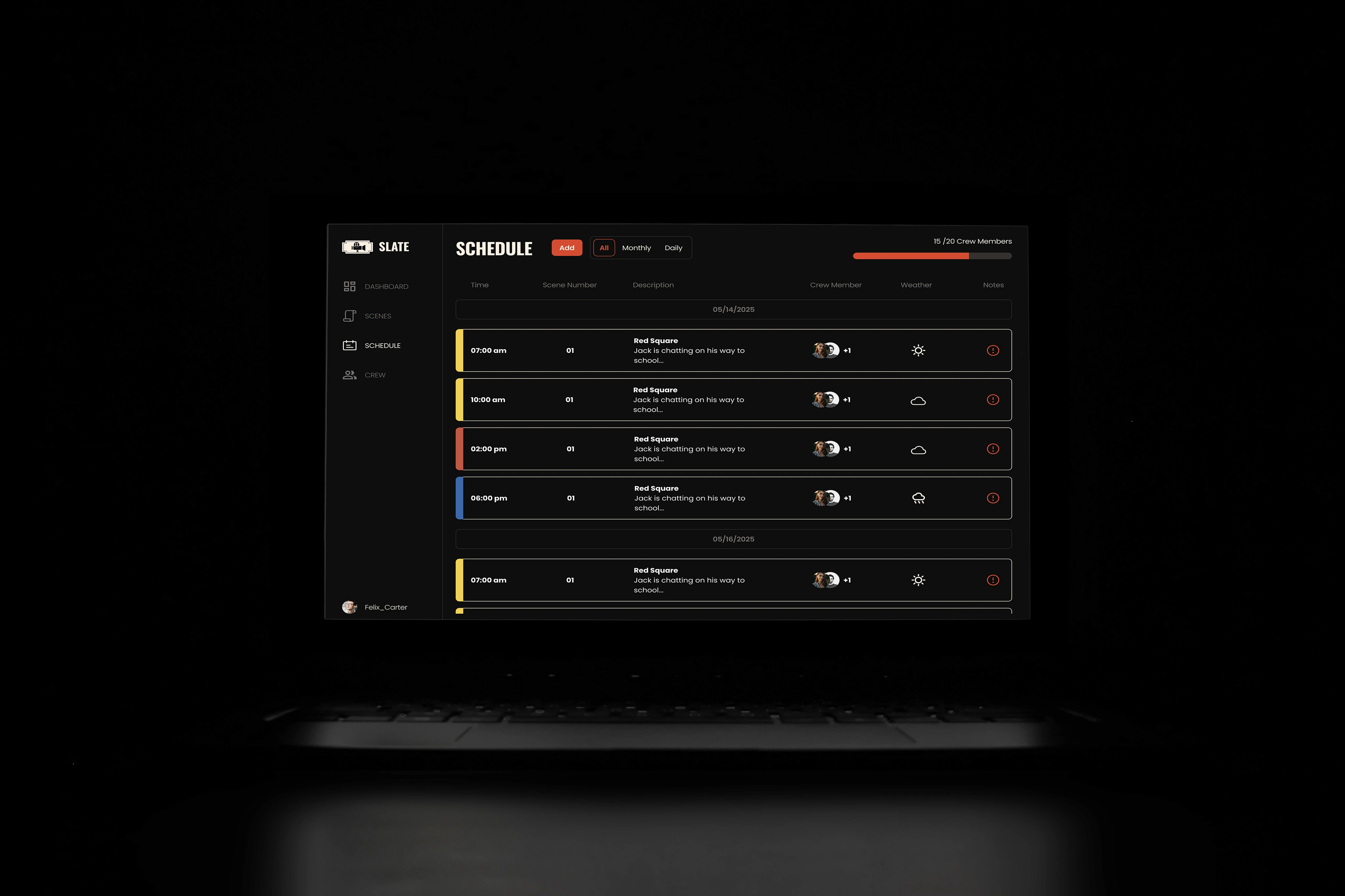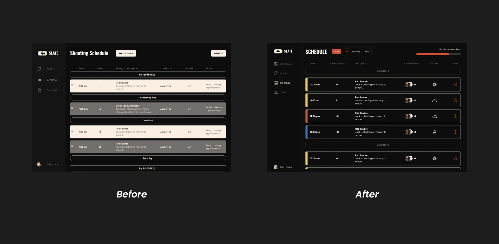 Slate is a sponsored project designed and developed by me and my team. Built specifically for indie filmmakers, it transforms the chaos of film production scheduling into something actually manageable.
