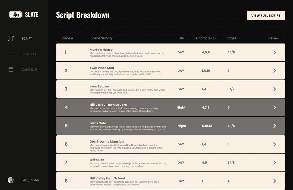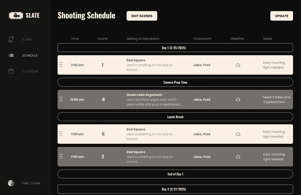 By combining script parsing, availability tracking, and automated schedule generation, SLATE gives small productions an affordable alternative to complex industry tools. This results in less time coordinating schedules and more time making films.