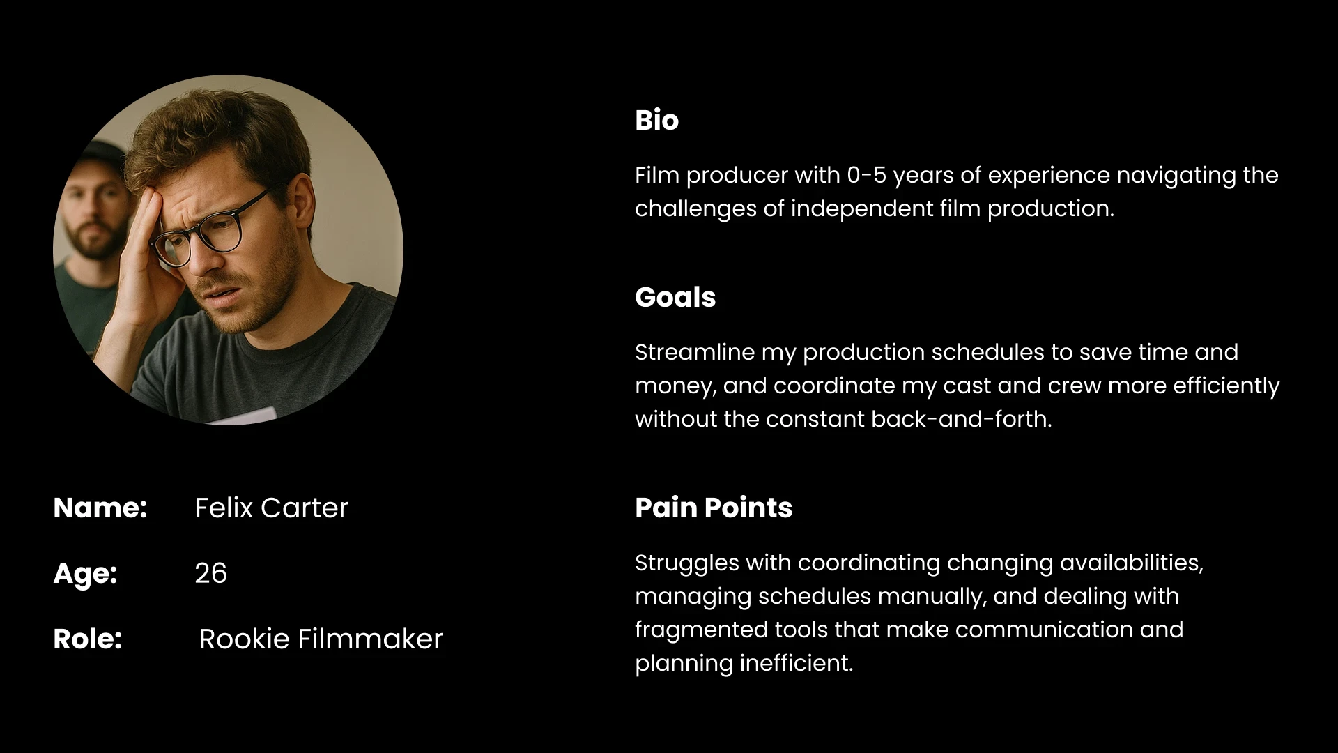 Gathered insights from over 30 filmmakers and student directors to identify common scheduling pain points, tool preferences, and workflow inefficiencies.